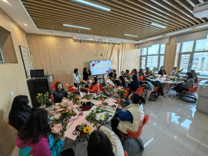 女教工们聚精会神聆听花艺师的讲解示范,在花艺师细致的指导下进行花卉选择、色彩搭配、花枝修剪和构图,教工们相互交流,相互帮助,现场洋溢欢声笑语。参加活动的女教工纷纷表示,这次活动不仅让她们学到了花艺技巧,还让她们感受到了艺术魅力和生活乐趣,并通过朋友圈分享喜悦心情,把美丽传给更多的人。